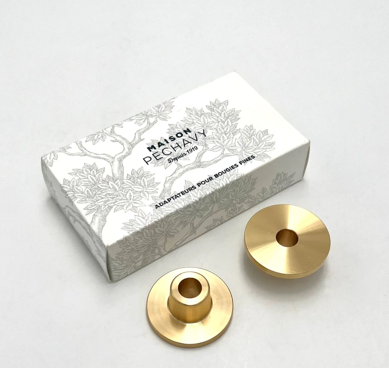 An original creation by MAISON PECHAVY, these small brass candle holders for fine candles are also adapters for standard candle holders.