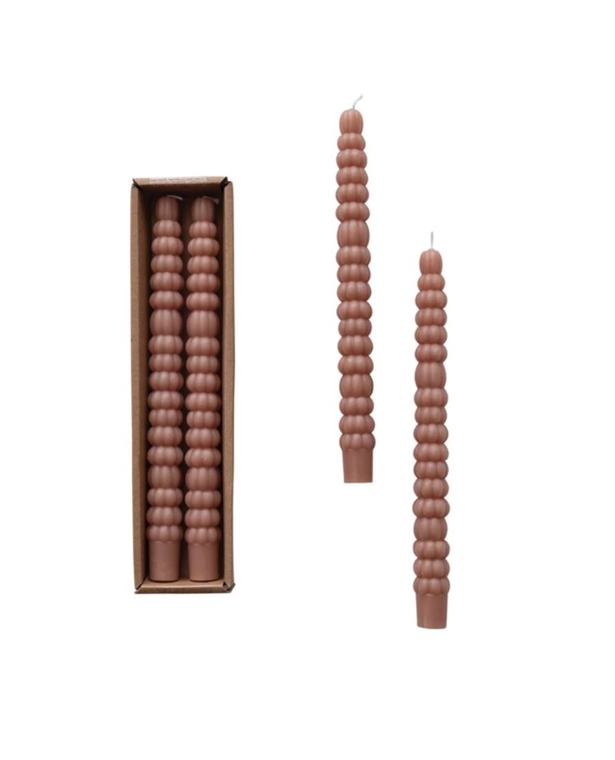 Add warmth to the home with these unscented pumpkin-shaped taper candles. This set features 2 pumpkin-shaped taper candles, that will brighten up any space. The candles are made of high-quality wax and a cotton wick for a clean and even burn. The candles have an approximate burn time of 7 hours.