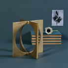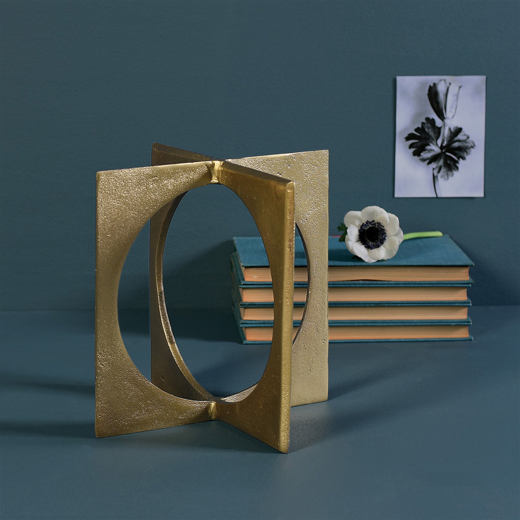 A collection of intriguing sculptural forms, some primitive some contemporary and all sure to add visual intrigue to a bookshelf or side table. Cast of aluminum and plated in brass or bronze.
